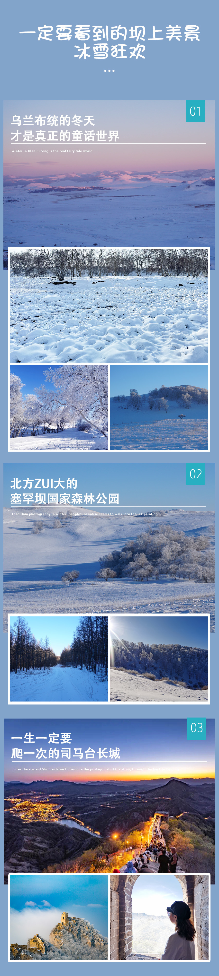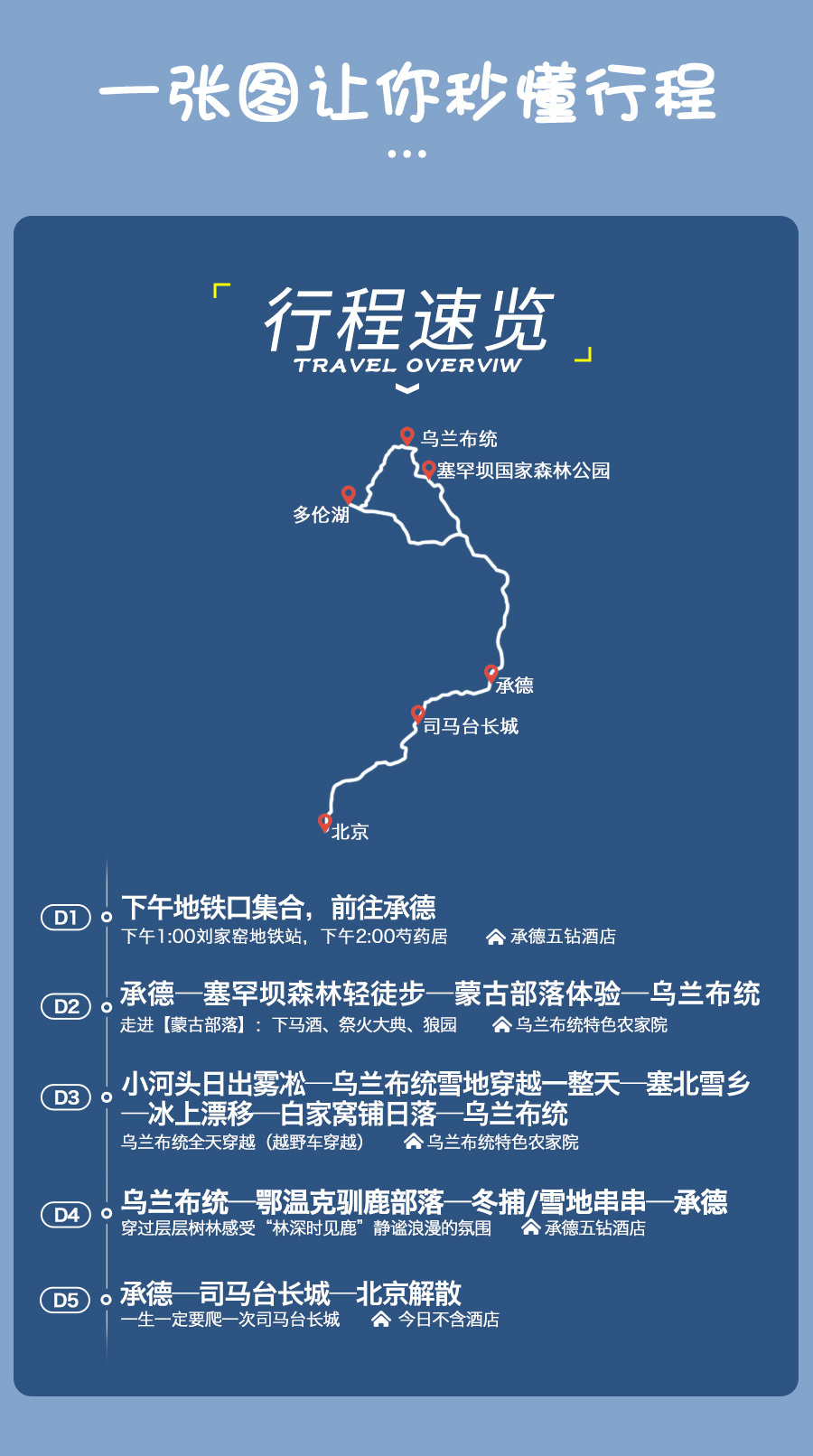 【交通】全程共用车费用(含司机、油费、过路费等等),北京往返乌兰布统根据人数安排车型:2-4人5座轿车或SUV、6-8人9座商务、9-14人15-22座小巴、15人-25人旅游大巴(15人以下司机师傅兼职领队,15人以上导游随团);乌兰布统安排越野车雪地穿越。