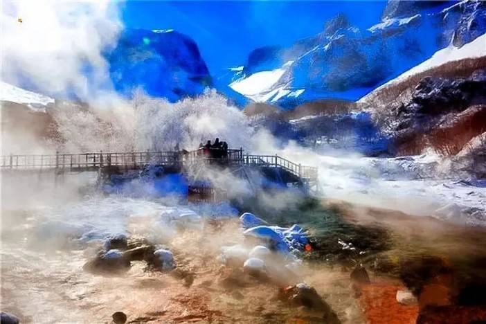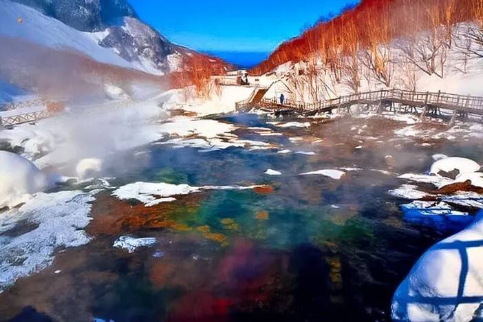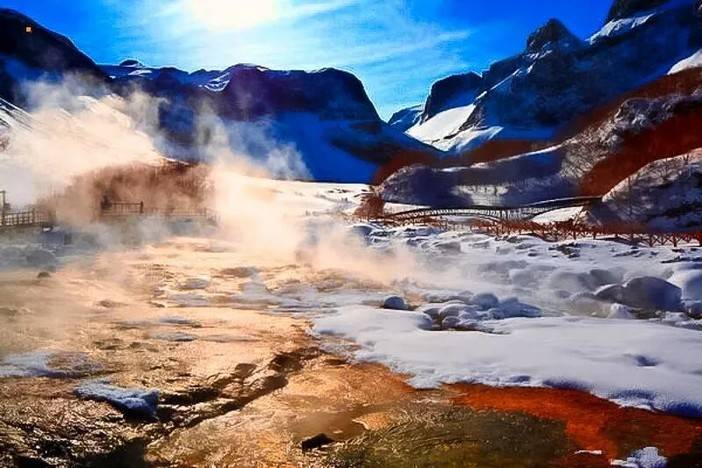 聚龙吐温涎,天冷升华烟。温泉周围白雪皑皑,一股热气蒸腾,旁边的树枝也都挂满了雾凇,这里10元3个的温泉鸡蛋一定要吃吃,像果冻一样的口感