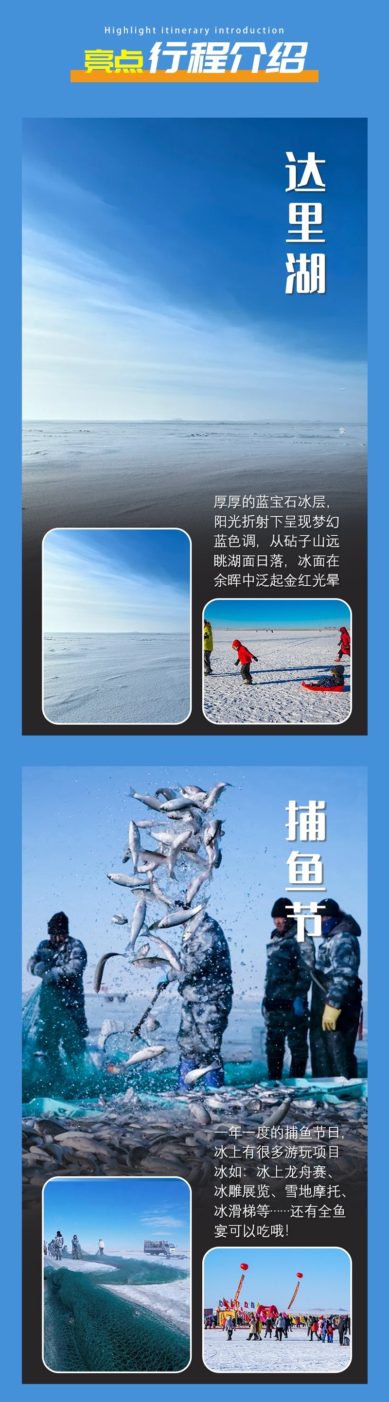 - 早餐后集合出发前往达里湖景区,达里湖封冻期可达5个月(11月下旬至次年4月),湖冰最厚超2米,湖面冰裂巨响源于昼夜温差引发的冰体膨胀挤压,而呈现梦幻蓝色的物理成因是冰晶对470纳米波长光波的极致散射。此处为高盐碱苏打型湖泊,冰点可达-5℃仍不封实,冬季渔猎沿用契丹族传世的"镩冰矛鱼"技法,现已成为中国冰泡湖观测的基准坐标。