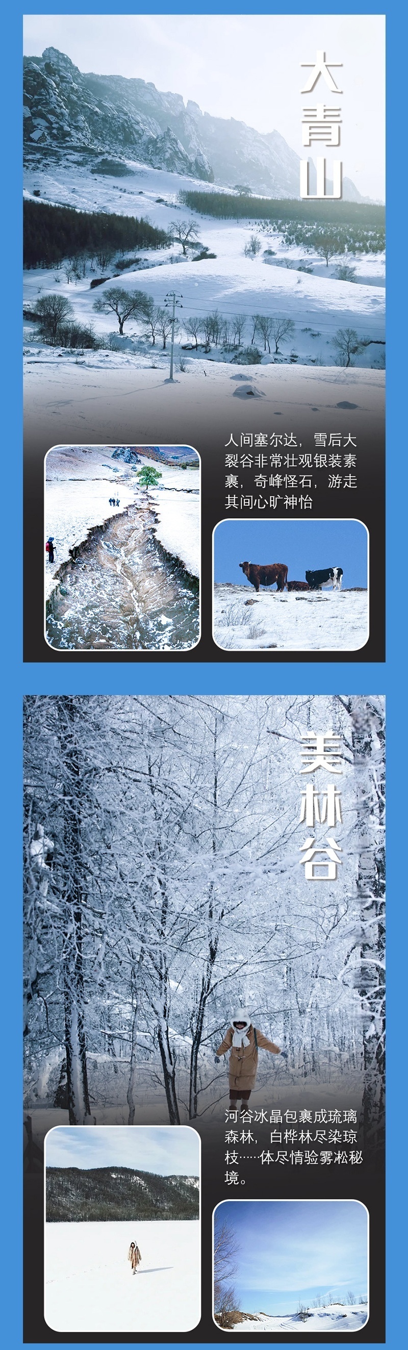 - 早餐后前往大青山徒步起点,位于克什克腾旗的大青山,拥有我国现存规模最大且保存完整的第四纪冰川岩臼群,以及由冰川雕琢而成的花岗岩石阵与深邃裂谷。冬季时,这些地质奇观在白雪的覆盖下更加壮观,这里的经典大裂谷,是必打卡之地。这里是内蒙"塞尔达"的世界,无垠的高山草原,无边的天空,无尽的自由。