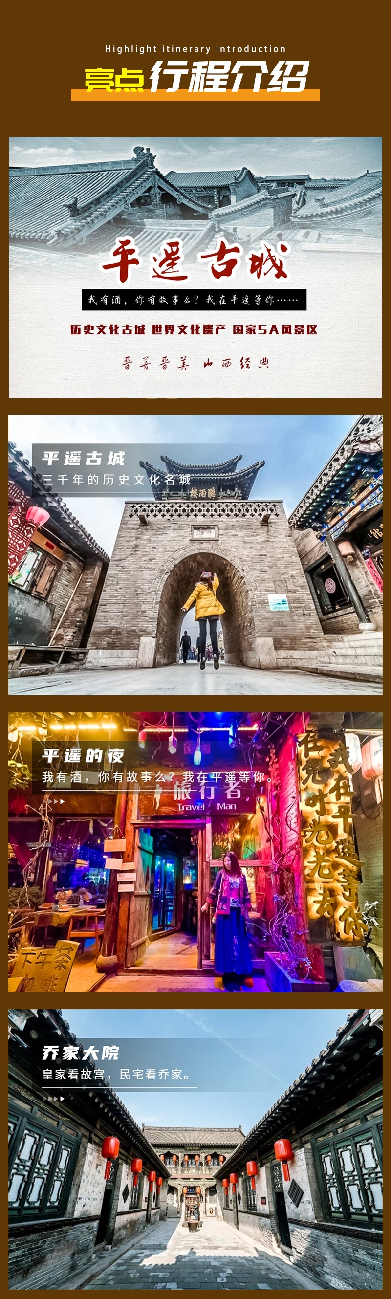 - 晚上|前往平遥古城办理入住后,大家自由享受古城的夜景,寻觅平遥美食;晚上可以自由结伴观看大型演出《又见平遥》,迷宫般的剧场有着繁复的空间分割,完全不同于传统剧场;平遥的夜,值得你用心去体会。