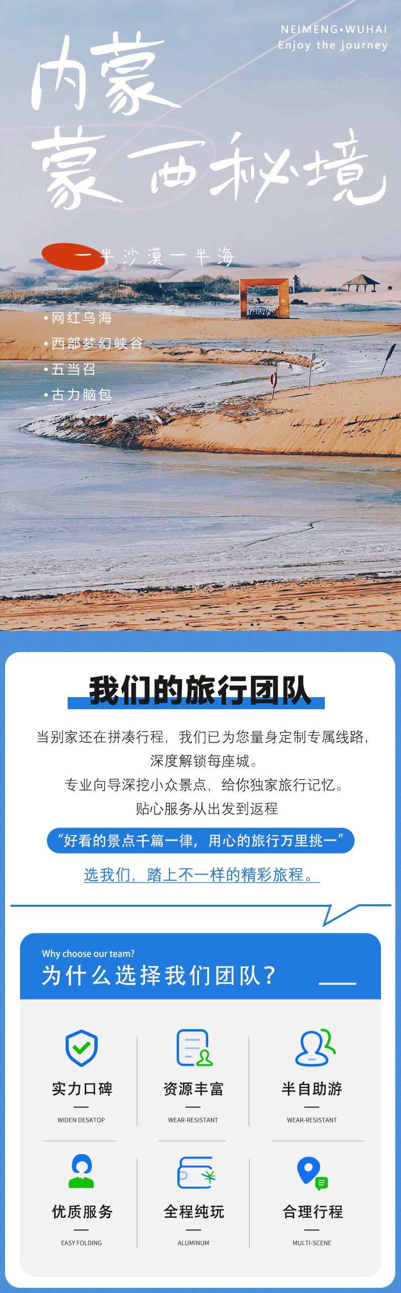 - 早餐后,集合前往乌海湖游览打卡乌海湖、网红枯树、网红沙漠公路、乌海沙漠!