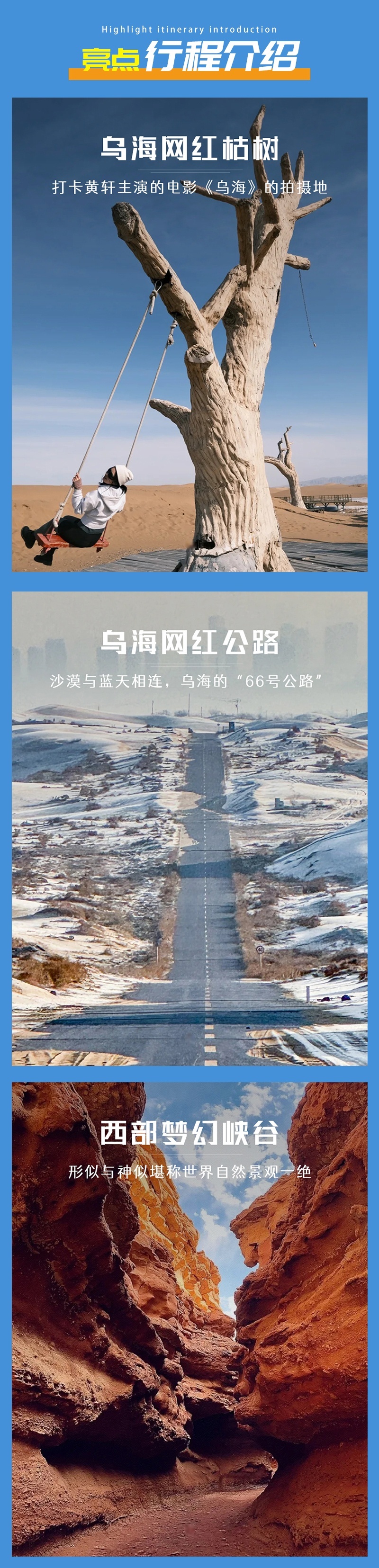 2)门票:西部梦幻峡谷门票60元+摆渡车15元,乌海湖68元(含往返摆渡车+网红枯树门票+网红公路打卡),五当召52元;其他景点暂无门票费用,如遇临时收费自理。门票价格供参考,以景区实际政策为准;