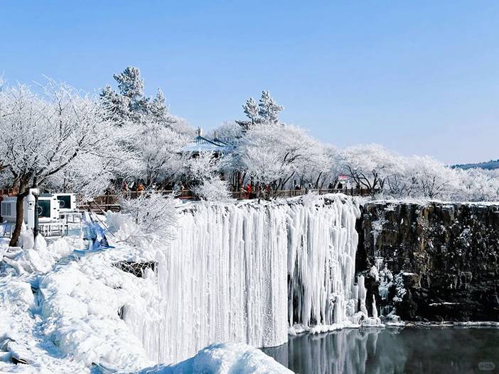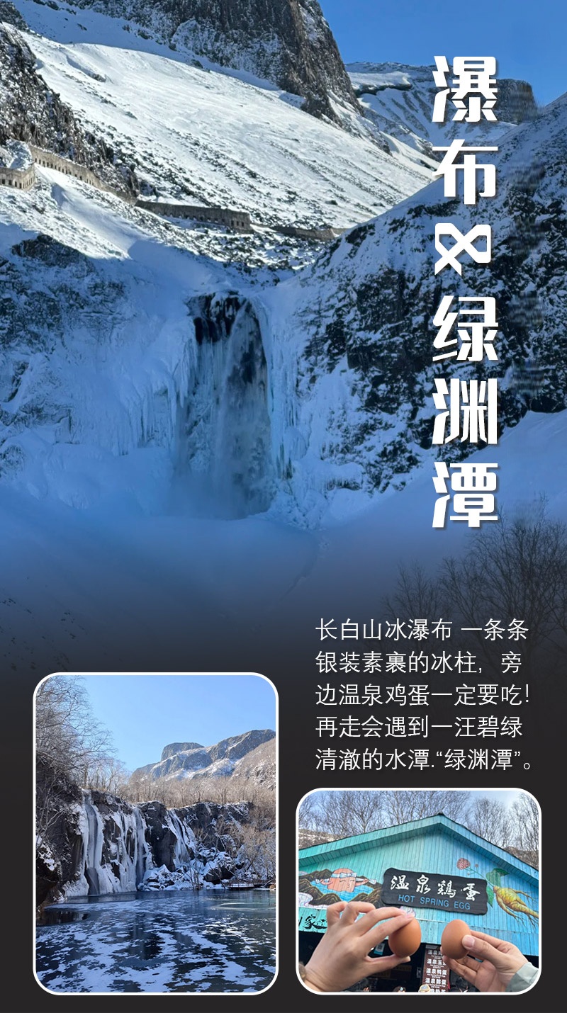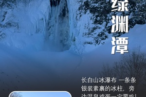 5)绿渊潭 天池过去走10分钟就到,潭边冻结的冰瀑与桦林巨石浑然一体。恰似人间仙境,就很漂亮