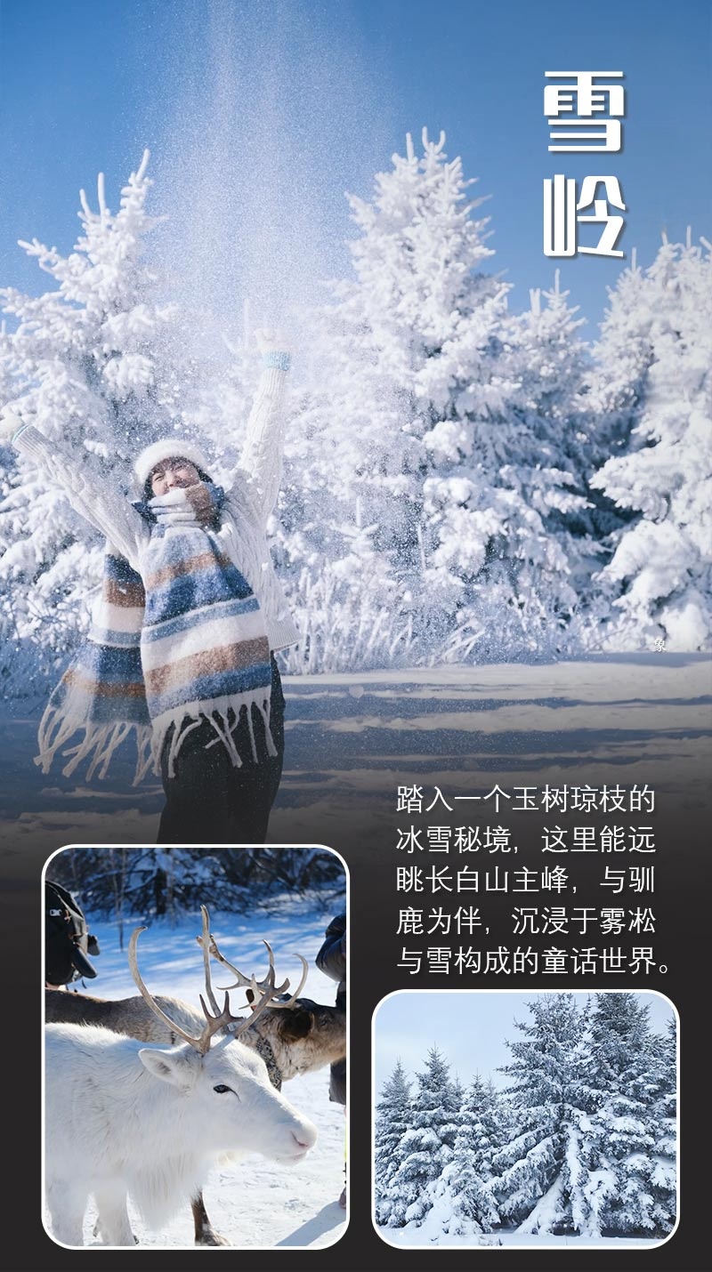 - 适时集合我们去雪岭,雪岭以雾凇、雪原景观为主,冬季宛如童话世界,适合摄影和轻徒步。每到冬季,这里就变成冰雪童话世界,天气晴朗时,可远眺望延绵起伏的长白山林海和巍峨耸立的长白山主峰,来到这里你可以领略独特的雪松、雪韵。每当遇到降雪时便会形成漫山遍野玉树琼花,美景尽收眼底。除了赏雪,戏雪、【网红驯鹿】,还可以自费体验【雪地摩托】,自由驰骋于冰雪海洋之中,尽情享受这冰雪盛宴。