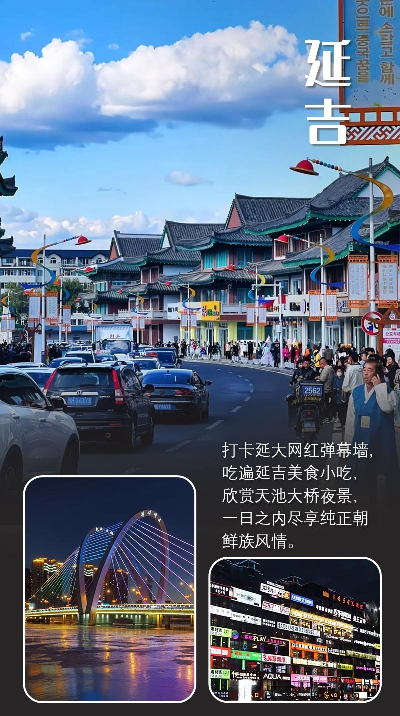 - 适时集合我们前往延吉打卡这座美丽的边疆小城,也是我国最大的朝鲜族聚集地。素有“足球之乡”、“歌舞之乡”的美誉。特别是延吉美食小吃众多,会让你味蕾大开,大饱口福。延吉朝鲜冷面,柔韧耐嚼的荞麦面,辣中带甜的泡菜,酸甜可口的牛肉汤,让人垂涎欲滴。参鸽汤,酥烂的鸡肉、精华的糯米、鲜香的鸡汤。打卡延吉大学城网红墙,延吉天池大桥夜景
