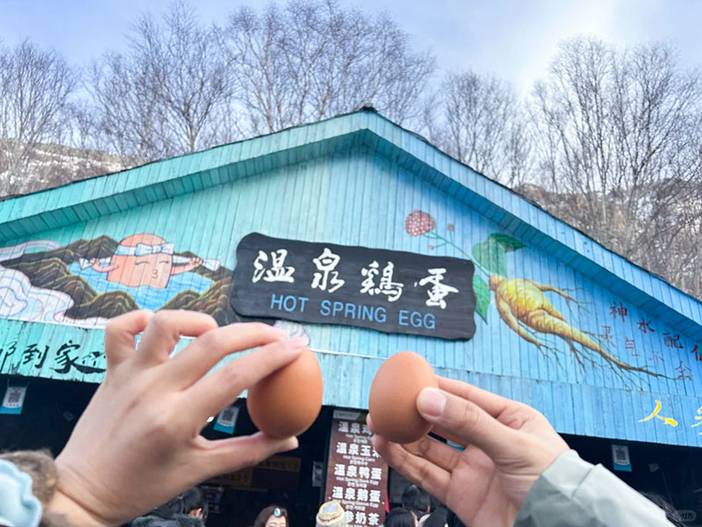 3)温泉 聚龙吐温涎,天冷升华烟。温泉周围白雪皑皑,一股热气蒸腾,旁边的树枝也都挂满了雾凇,这里10元3个的温泉鸡蛋一定要吃吃,像果冻一样的口感