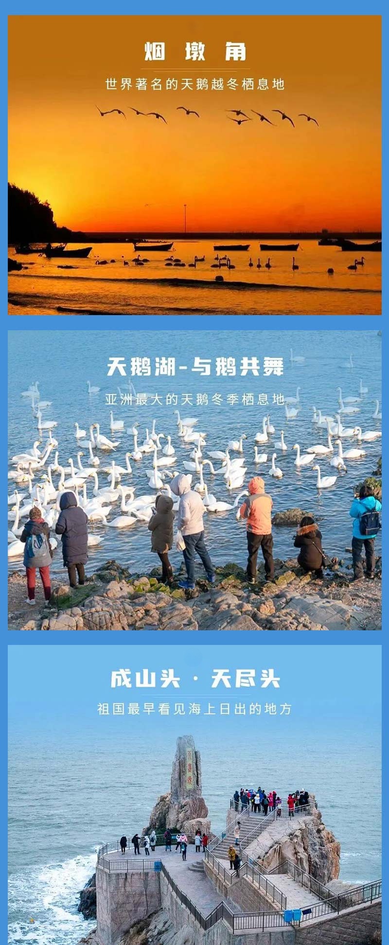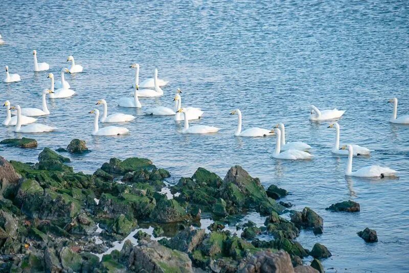 每年十月份以后,大批的天鹅迎着西伯利亚的冷空气逆风飞翔,不远千里万里,来到荣成过冬。成千上万只野生的大天鹅从遥远的西伯利亚、贝加尔湖、新疆和内蒙成群飞到荣成的海湾和湖泊栖息越冬。烟墩角天鹅湖就是其中之一,烟墩角也因此有了“天鹅村”的美誉。