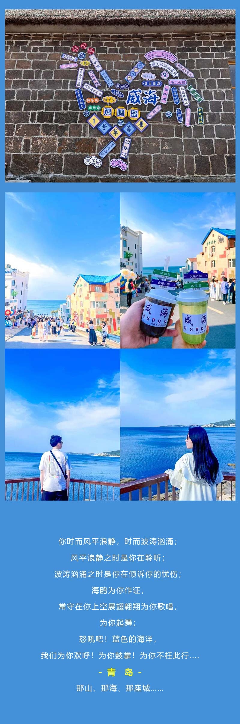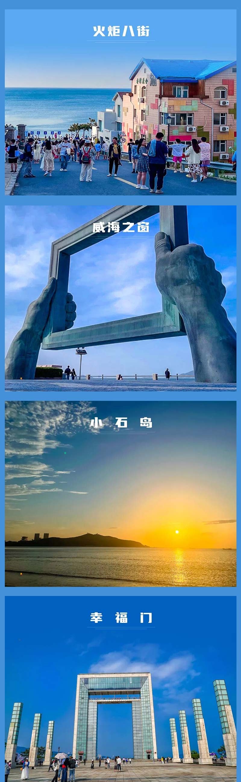 - 早起继续出发前往威海,抵达威海后我们先去酒店办理入住。之后可以结伴品尝威海美食,自由游览威海最美海岸线(可以打卡火炬八街、幸福门、威海之窗等网红景点;还可以游览威海公园、悦海公园、海源公园、海上公园等海岸线公园;傍晚可在小石岛欣赏日落;晚上可以自由前往韩乐坊夜市品尝美食小吃)。