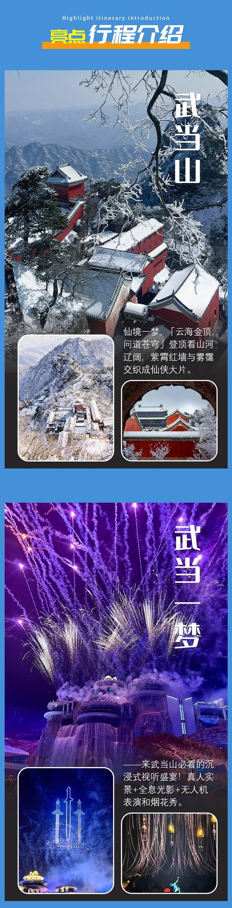 1)门票:武当一梦景区免费(但建议提前预约1.1日主秀《武当一梦》19:30场次);武当山景区需提前预约1.2日门票+紫霄+金顶最早时间段;门票价格以景区实际为准,有门票打折证件的带上!