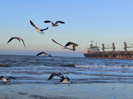 - 早起我们继续出发,下午我们首先到网红布鲁维斯号沉船打卡。它是一艘海边搁浅的来自巴拿马籍的货轮,2022年9月,受环流影响搁浅于山东威海那香海海域。