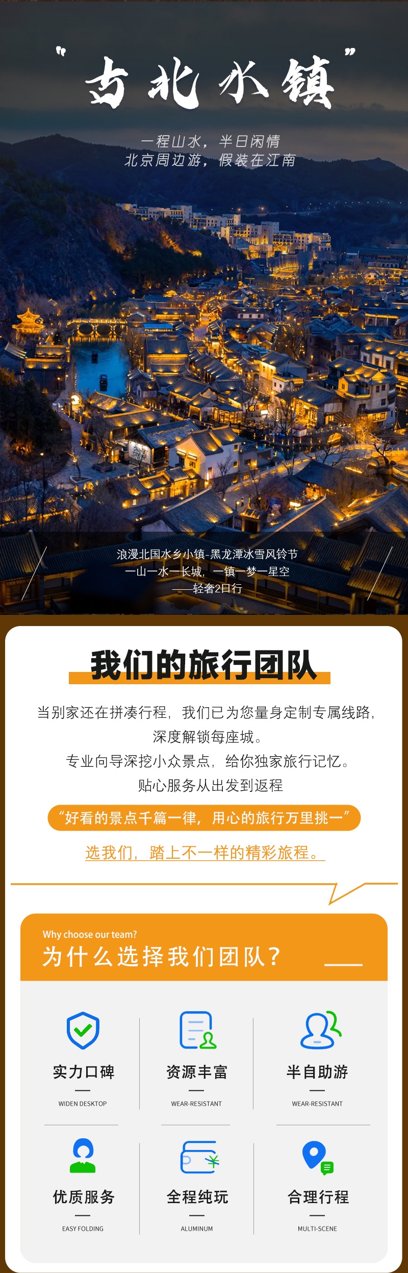 古北水镇,又被称作“北方乌镇”,位于北京市密云县古北口镇,背靠中国最美、最险的司马台长城,坐拥鸳鸯湖水库,是京郊罕见的山水城结合的自然古村落。整个镇子沿着水系而建,既有南方水乡的特质,又有北方村落的格局,还紧邻司马台长城,整个建筑群规模宏大而又浑然一体。这里是一个能满足“北方游客看水镇,南方游客登长城”多种需求的特殊载体。