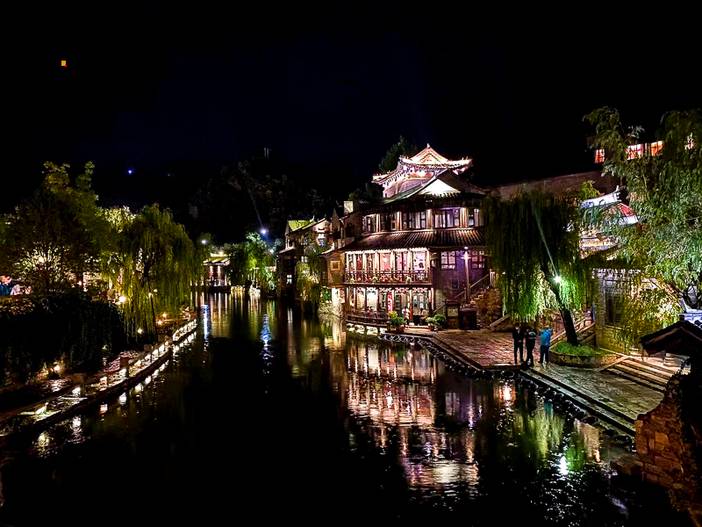 等到夜幕降临,古北水镇如同戴上了金色的薄纱,整个镇子都亮起了金色的光,我们可以到牌楼附近的大戏台看看镇子上免费的表演,也可以尝尝戏台前的小吃摊,这时你就会有种穿越的感觉,坐着宽板凳,听着戏、相声,我们仿佛回到了古代。