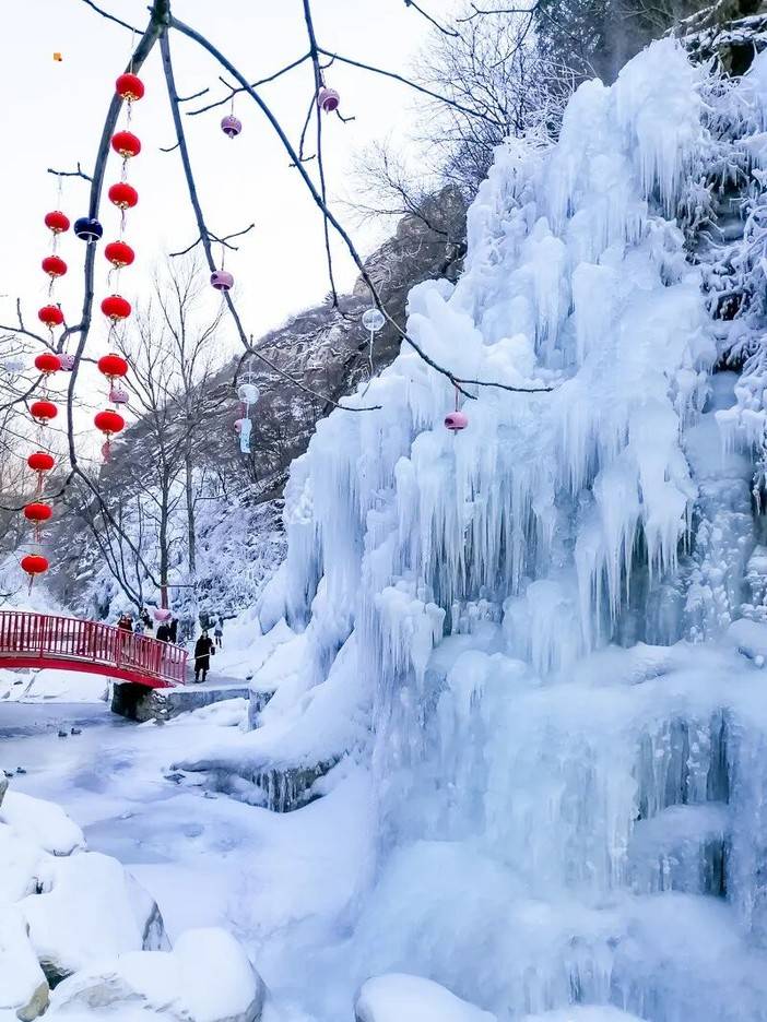 在全长4公里,水位落差220米的悠长峡谷中,长短不齐、大小不一、形状各异的冰挂、冰花晶莹剔透,昔日活跃的山泉瀑布此刻定格成冰瀑奇观,层层叠叠如玉雕般散落在峡谷各处。盘山栈道黑龙潭峡谷里轻轻摇荡,与冰瀑相映成趣,随风叮当作响,乐音响彻山谷。在这里,你可以见到很多网红小姐姐拍大片哟。