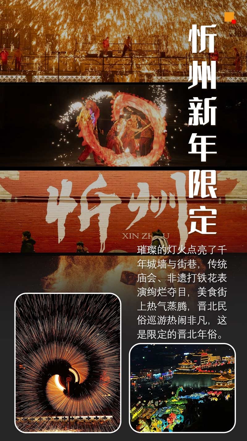 来这里,赴一场限定春节,一场灯火、年俗与烟火气交织的沉浸式盛宴。当夜幕降临,千年古城在璀璨光影中苏醒,为您呈现一个既传统又生动的晋北中国年。古城墙上,以“锦绣中华”、“晋北风情”等为主题的巨型灯组璀璨夺目。南北大街、泰山庙巷等主要街巷挂满红灯笼、诗词灯、伞灯,一步一景,温馨浪漫。不容错过的重头戏!夜幕中,高达1500℃的铁水被击打向空中,瞬间化为漫天华彩的“流星雨”,金光裂空,震撼至极。通常在南城门广场或特定场地举行。热闹的社火队伍穿行于古街,舞龙、舞狮、秧歌、旱船、八音会等传统表演,让您零距离感受晋北的民俗活力。从冒着热气的保德碗托、忻州瓦酥、定襄蒸肉,到香甜的糖画、冰糖葫芦,各种地道山西小吃与天南地北的年味汇聚一堂,满足所有味蕾。街道两侧的店铺与摊位摆满了老陈醋、布老虎、剪纸、文创产品等特色年货,充满寻宝乐趣。来这里,就是赴一场穿越古今的华彩夜宴。