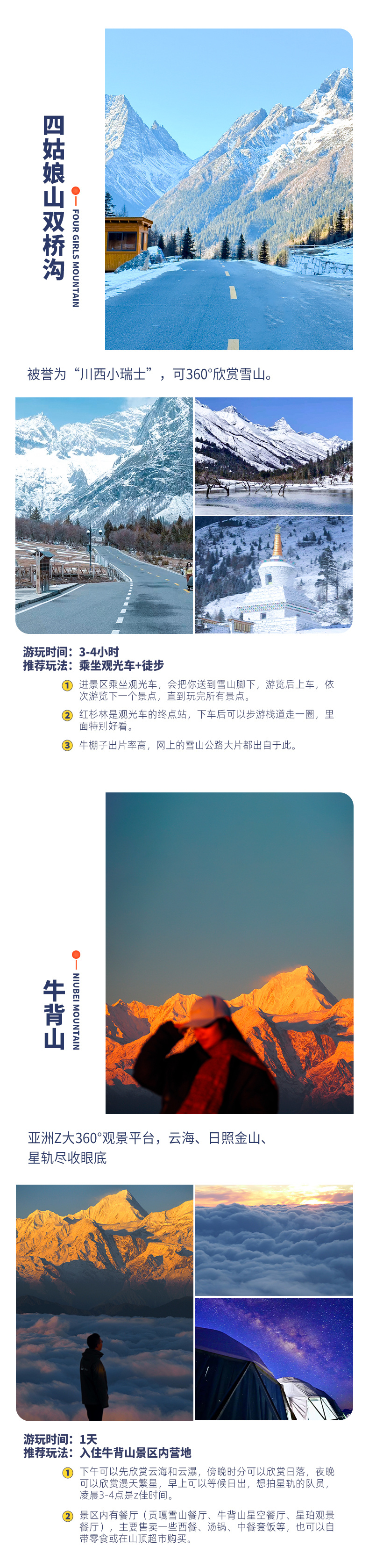 4、景交:四姑娘山双桥沟观光车70元/人(必须);墨石公园观光车20元/人(必须);红海子清洁费30元/人(可选);木雅大寺门票16元/人(可选);泸定桥上桥保险5元/人(可选);牛背山卡丁车单程140元/车/双人(可选),目前牛背山免观光车(如后续开始收费请自理);