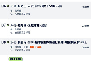为保障最佳观赏体验,在行程第9天我们根据桃花花期的差异设计了2种方案,第01-04期雅鲁藏布江大峡谷沿线桃花更盛,第05-08期索松村沿线桃花更盛,您可根据偏好选择心仪的团期出发。