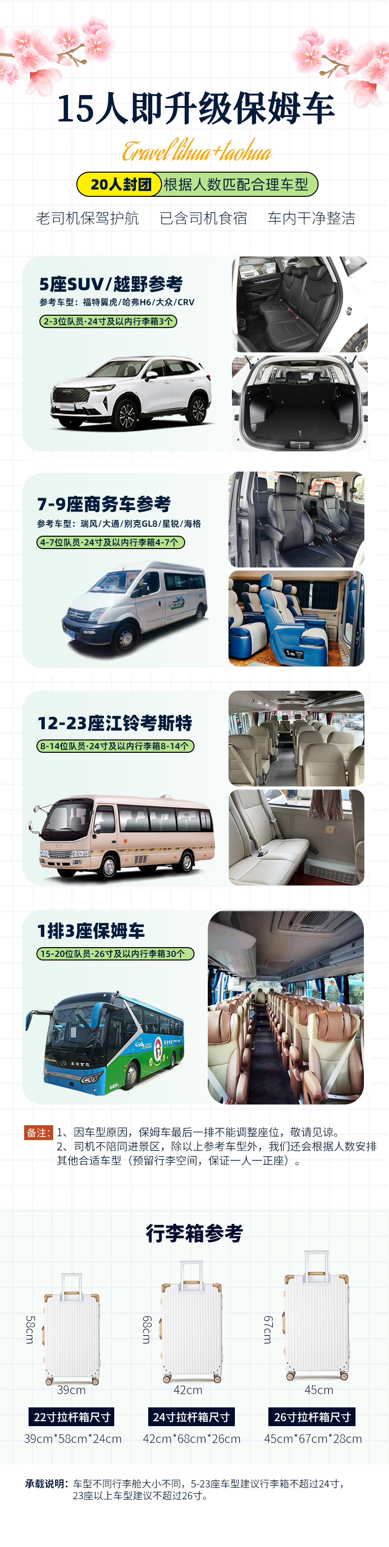 1、交通:根据人数确定车辆,15人即升级保姆车(已含驾驶员食宿);