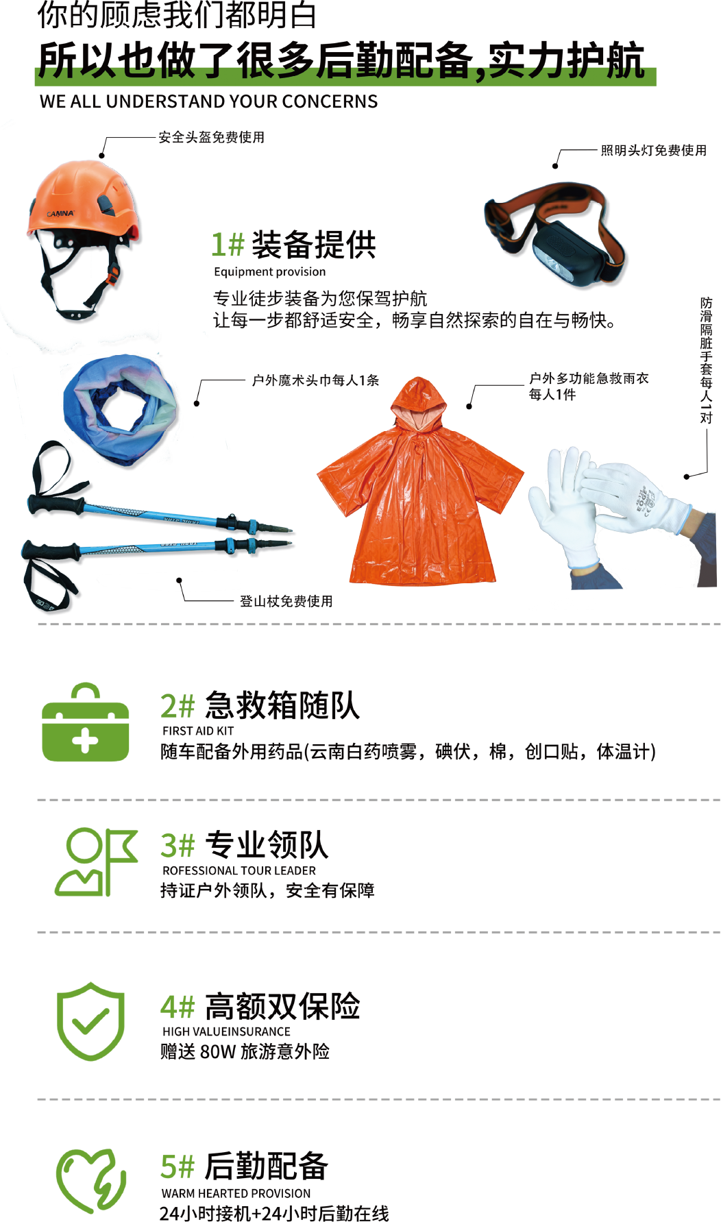 4.活动提供装备中说明的:头盔/头灯/登山杖各一件免费租借(用后回收,如需要双杖请提前告知),赠送头巾/手套、户外多功能急救雨衣(不回收)