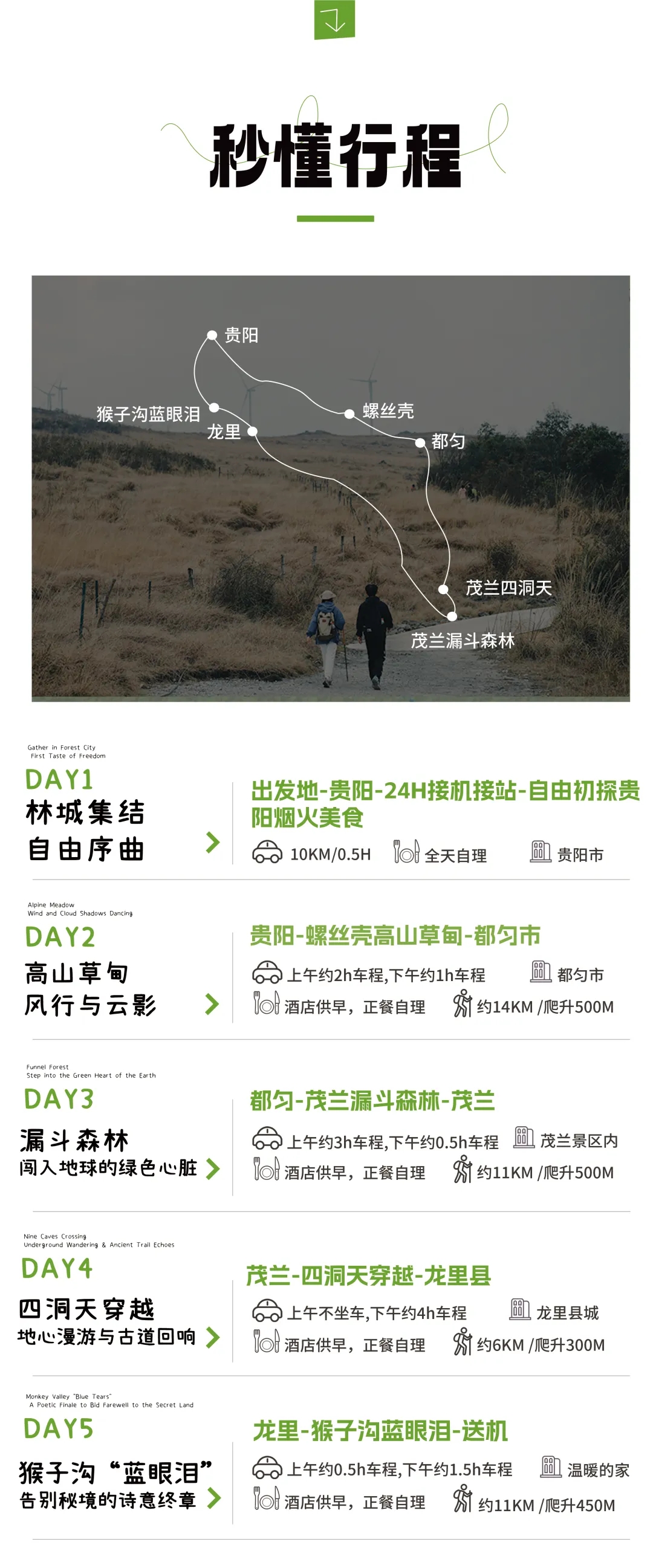 ①今天的徒步路程约11公里,累计爬升约500米(下降约350米),以喀斯特地形地貌为主,需要穿越密林山路。