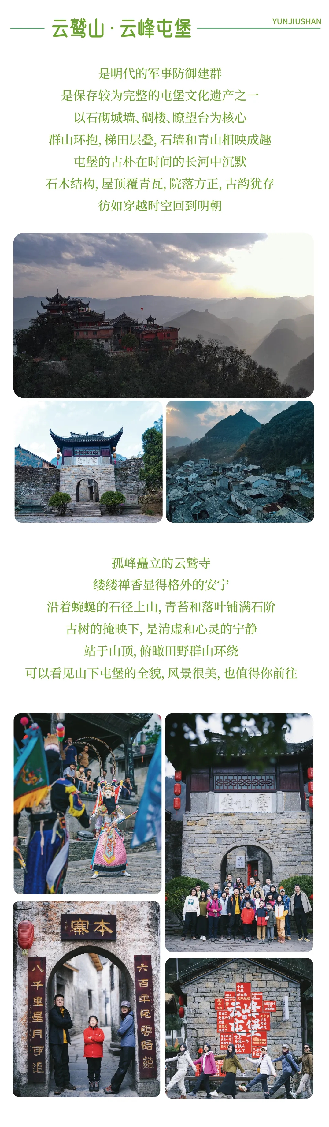 早餐后告别自然荒野,驶入历史长廊。登顶云鹫山,俯瞰万亩喀斯特坝子。随后深入云峰屯堡,这里的居民仍保留着明代的生活习惯和服饰。我们将在本寨等古屯堡中穿梭,看石头城堡、听神秘地戏,了解独特的“屯堡文化”。午后适时集合,乘车返回贵阳抵达机场及高铁站,行程结束。