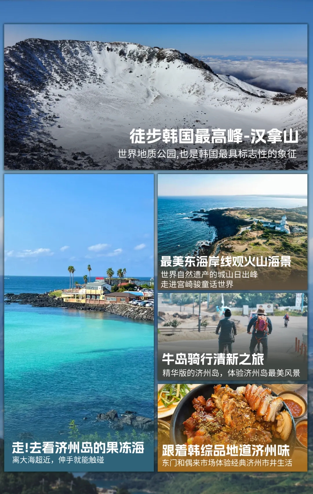 · 地理环境:济州岛的地形以山地和火山口为主。如果计划前往汉拿山等登山活动,务必随身携带足够的水、食物和适当的徒步装备。