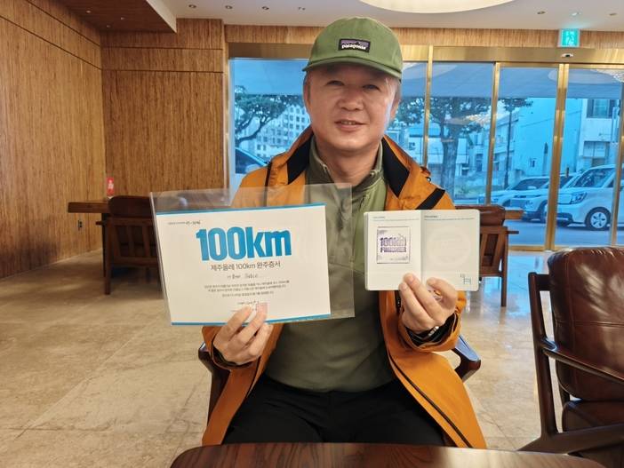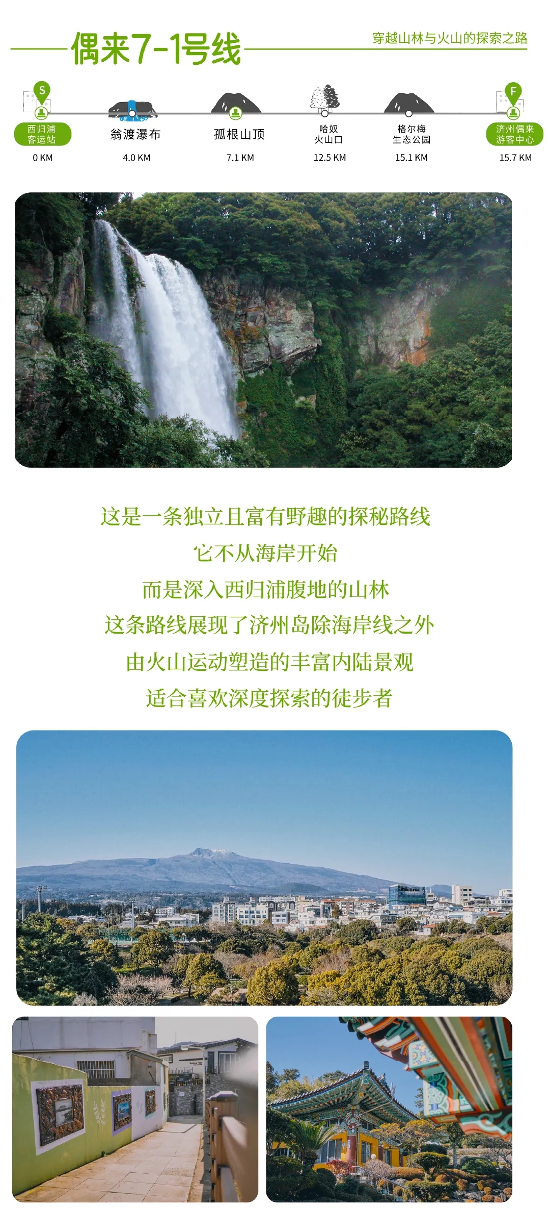 早餐后退房,将行李统一寄存前台。今天我们将完成100km。到达孤根山脚下,我们沿着步道而上,没多久到达山顶,蓝色小马就在我们面前,盖完章下山,路过翁渡瀑布,来到西归浦客运站,这里是7号线的终点和7-1的起点。