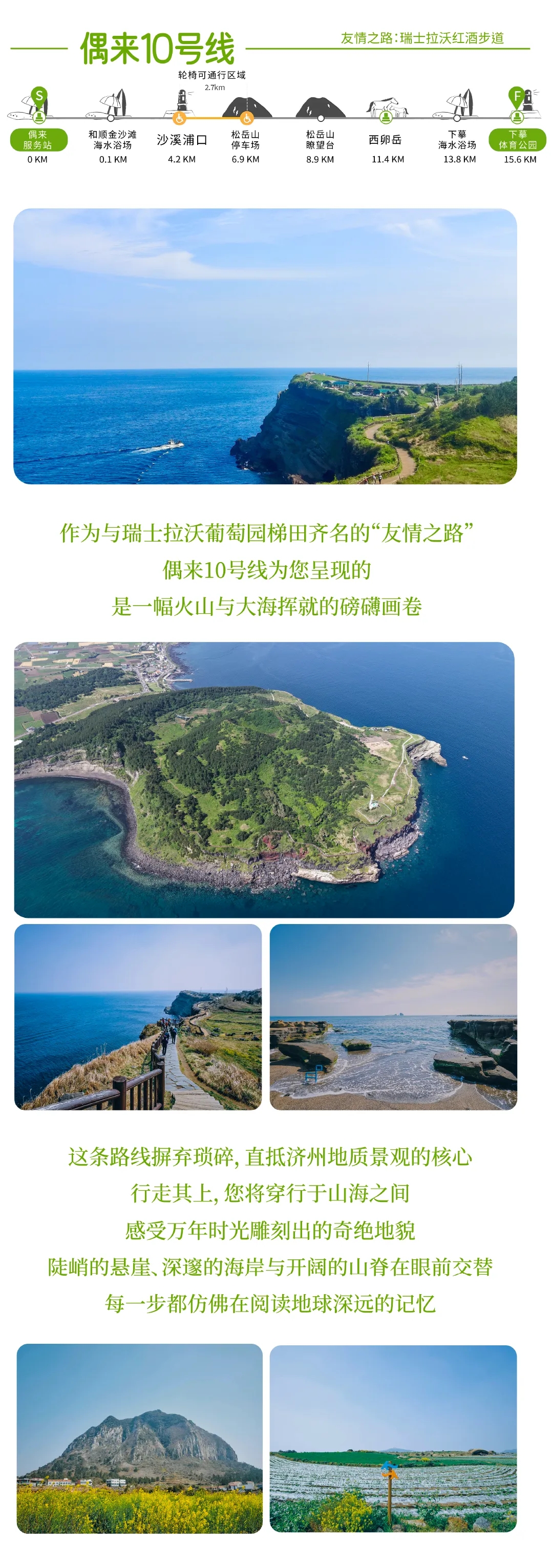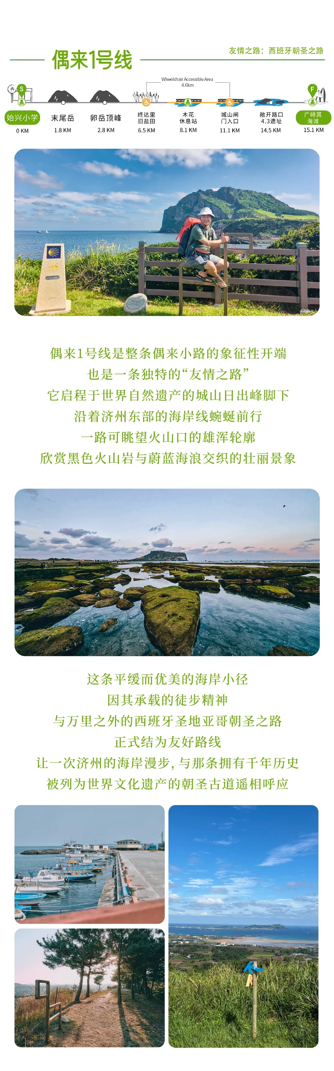 早餐后坐车前往1号线起点,这也是济州偶来最先开始的路线,真正意义上的起点。经过绿油油的田野,登上末尾岳、卵岳,看到城山日出峰、牛岛,一眼望去犹如展开画布的原野和大海。黑色石墙围绕的田地星罗棋布地连在一起的田野,就像用五连六色的布缝好拼贴上的一张方格布一样的美丽。
