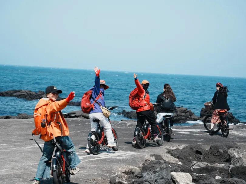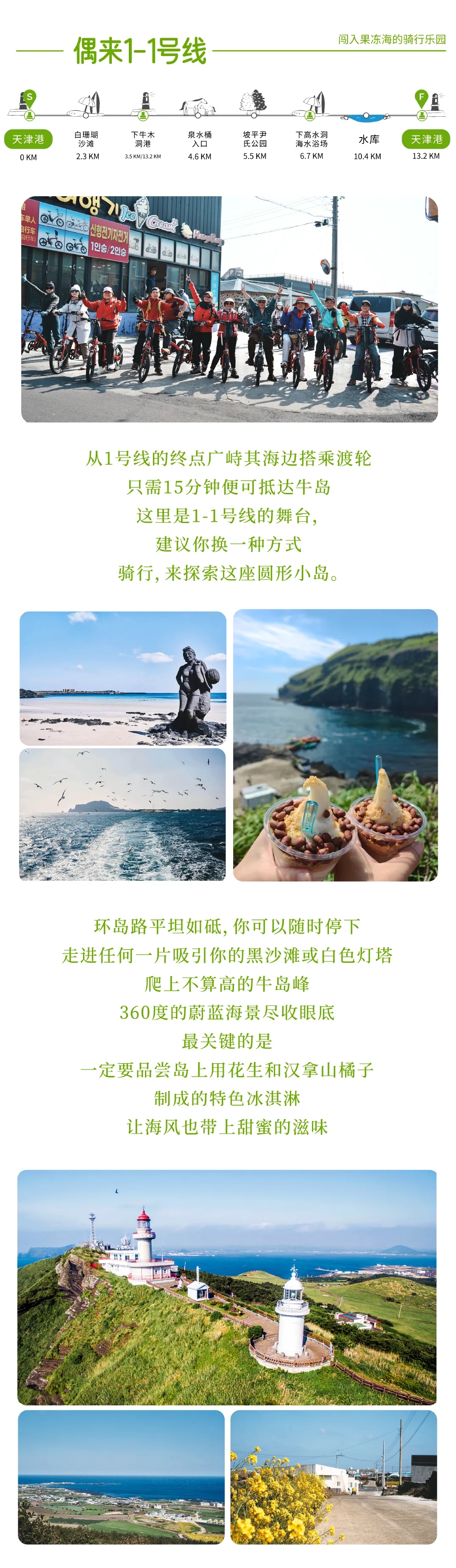 到达城山港,我们切换模式,乘船前往牛岛。上岛后,我们将用车轮来丈量1-1号线,自行车环岛骑行(骑行时间2个多小时就能环岛一圈),济州岛的自行车都是带助力的,所以骑起来非常轻松,一路走走停停。