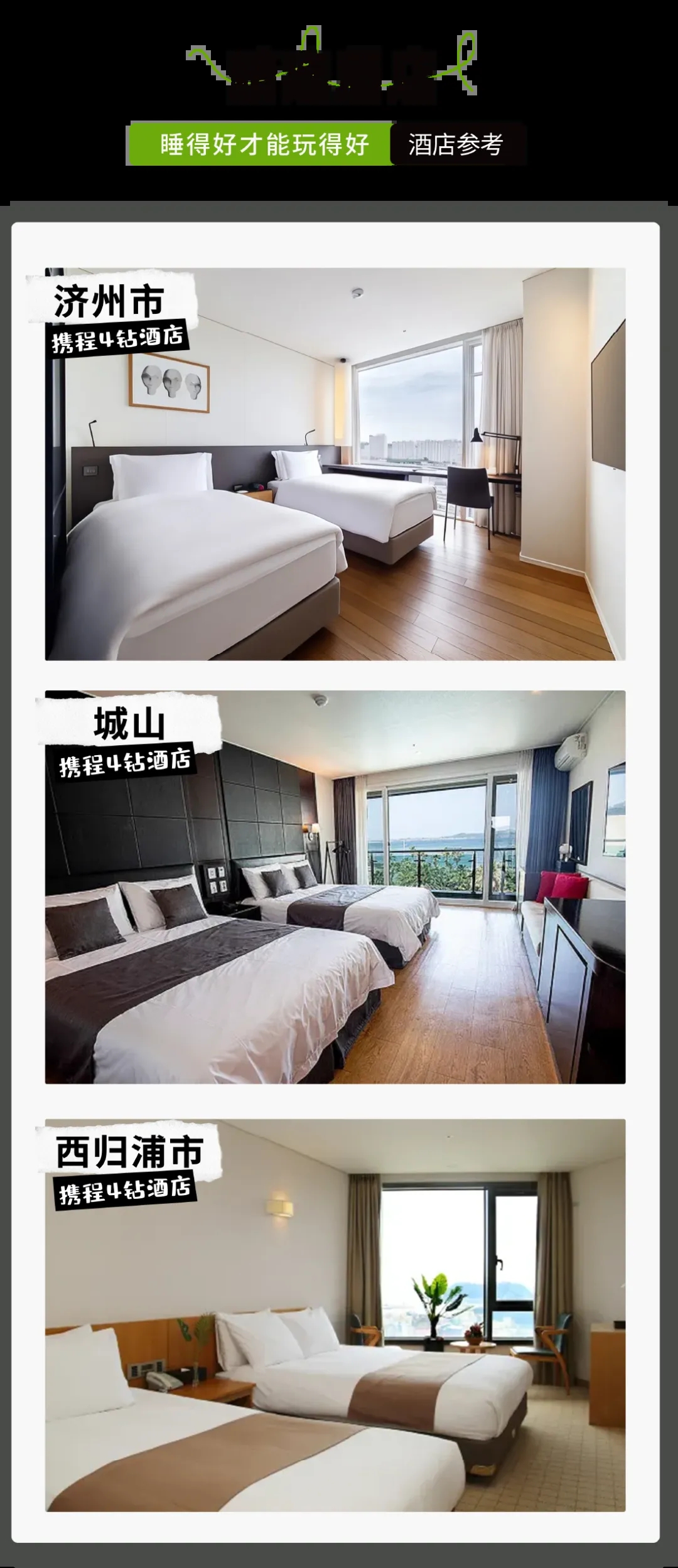 住宿:四钻酒店5晚(济州1晚+城山2晚+西归浦2晚)