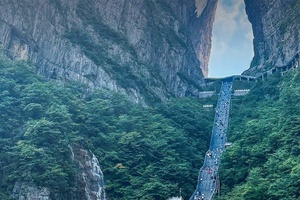 - 早餐后从酒店集合出发,前往【天门山国家森林公园】游览,约中午抵达。天门山:文化底蕴深厚,有“武陵之魂”之称,更有湘西第一神山的美誉,它兼峰、石、泉、溪、云、林于一体,集雄、奇、秀、险、幽于一身,被誉为空中原始花园。我们乘坐天门山索道,前往游览天门山:观天门洞、99道弯公路奇观(通天大道)、李娜别墅、鬼谷栈道、鬼谷兵盘、云梦仙顶、天门山寺、灵泉院、木石之恋等著名景点。天门索道:索道线路斜长7455米,上、下站水平高差1279米,是世界最长的单线循环脱挂抱索器车厢式索道,犹如一道彩虹飞渡“人间” “天上”,又象一条巨龙腾翔素云苍穹,依山籍壁,拔地冲天,荡气回肠,恢宏壮观,成为天门山旅游风景区“四大奇观”之一。