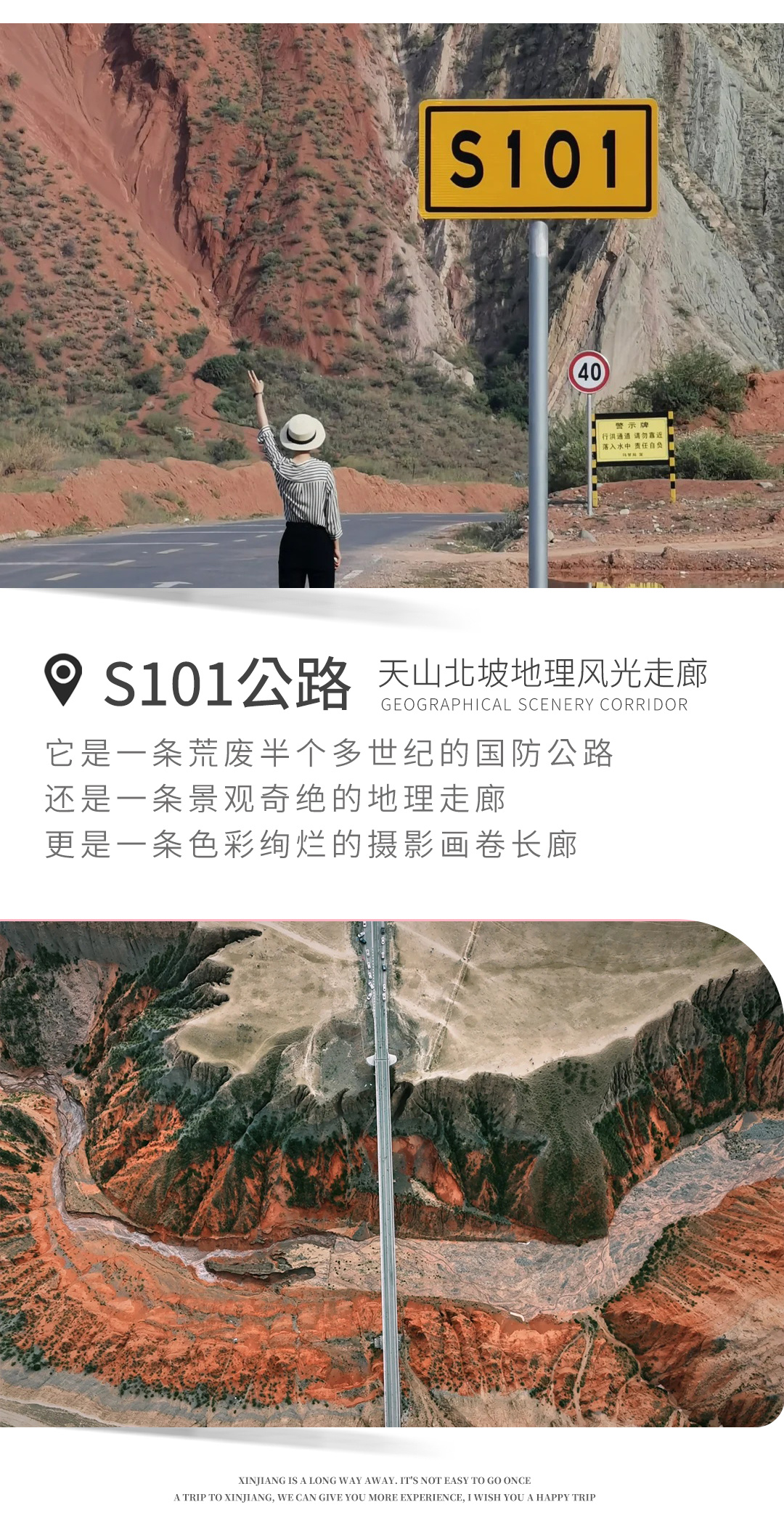 随后将前往网红公路,就是号称天山北麓景观地理画廊的【101丹霞公路】。这里的地貌为地震断裂和风蚀地带,各色岩石、黄土构成了壮美的峡谷风光。与张掖的丹霞地貌相比,七彩山峡谷的色调没那么浓烈,红是浅浅的红,紫也是淡淡的紫,连山脚下的黄土也没有那么明丽。连绵起伏的丹霞地貌、形态各异的侏罗纪山系,各色岩石,黄土构成了壮美的峡谷风光,峭壁悬崖,层层叠叠。今天一路走走停停,尽情拍摄。